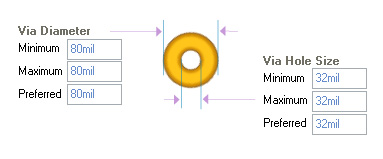 Next you need to define some rules which the routing software will follow. The values in the pictures on the left are minimum values that will produce an artwork which is easily transferable on to PCB. If you decide to use smaller sizes and clearances you may run in to problems of broken tracks or tracks shorting during the transfer process. This step is the most important one for successful and hustle free PCB manufacture. You may experiment with different values if you need to adjust clearances and sizes on some projects but I would try to stick as close to these values as possible. If the PCB size allows greater sizes and widths then feel free to adjust as needed. I tend to make my POWER tracks (GND and V+) thicker than signal tracks.